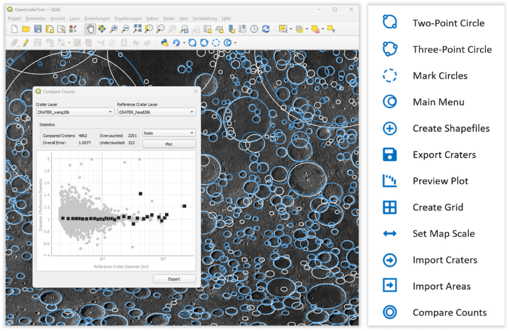The OpenCraterTool is a planetary mapping aid provided as Open Source plugin for QGIS. It helps meaasuring impact crater size-frequency distributions, and estimate planetary surface ages.